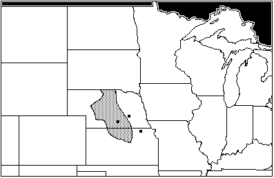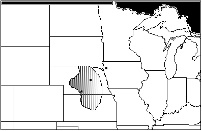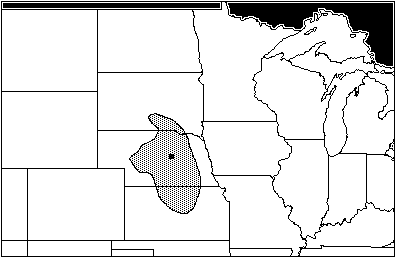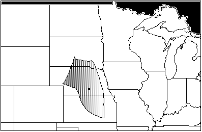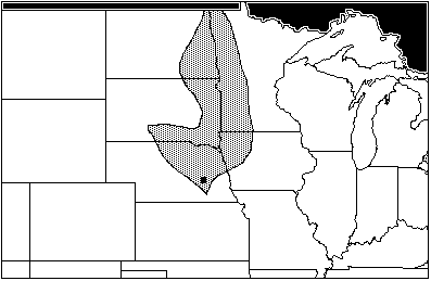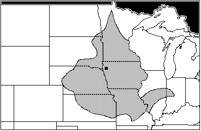 The oldest site, Rainbow, in northwestern Iowa, also has the longest record of habitation. It contains four cultural horizons dating from AD 250 to AD 675. (Falk & Semken 1990: 145 164.) The Rainbow assemblage from all four horizons included: Sylvylagus floridanus, the eastern cottontail; Citellus tridecemlineatus and Citellus franklinii, the thirteen-lined ground squirrel and Franklin's ground squirrel; Sciurius niger, the fox squirrel; Geomys bursarius, the plains pocket gopher; Synaptomys cooperi, the southern bog lemming; and Microtus ochrogaster, the prairie vole. The area of maximum sympatry for all four horizons is fairly large, stretching north into northwestern Minnesota, west to the Nebraska panhandle, south to the Ozarks of Missouri, and along the Mississippi. G. bursarius defines the eastern border of the area of maximum sympatry-- generally along the Mississippi River, with a projection into central Illinois and Indiana (Figure 1). All seven of the species are found in this area. The assemblage is dominated by eastern fauna, many of which live in wooded or marshy settings (i.e. Sciurius niger, Sylvilagus floridanus, and Synaptomys cooperi.) The others, however, show a favoritism towards open or meadow settings.